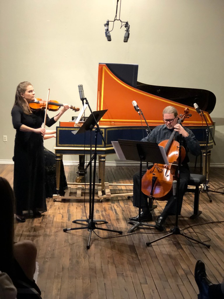 The theme was “Celebrating Women in the Arts,” and a crowd of about one hundred heard works of Elizabeth de la Guerre, Amy Beach and Fanny Mendelssohn Hensel, played by violinist Natalia Korenchuk, cellist Jayson Bishop and Lucy Tan on both piano and harpsichord. Dr. Kimberly Heib and Greg Rohloff joined the artists in a pre-program talk.