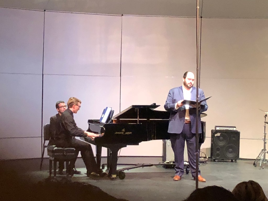 In the program’s first number Nate accompanied tenor Eric Barry in Nate’s rendition of Shenendoah: Away Home. Originally composed two years ago, this adaptation maintains the stirring spirit of the iconic Shenendoah while enhancing the piece musically. At one point Barry hit and held a high A which rolled up to a B-flat. That certainly got everyone’s attention!